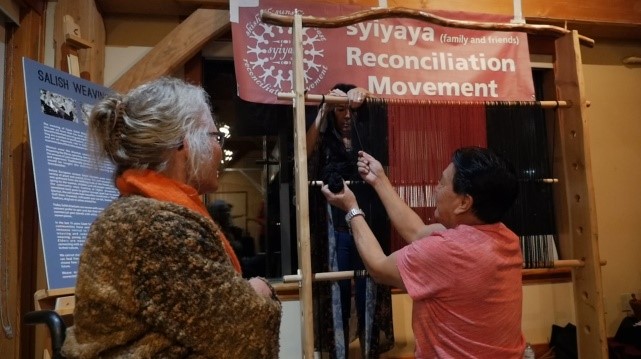 The “Weaving Tears into Dreams of Reconciliation” Project honoured the shíshálh art form of weaving as four master weavers were commissioned to lead the public in the design and creation of reconciliation blankets and sashes. The goals of the project were: